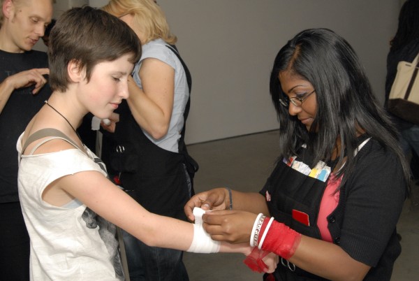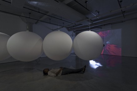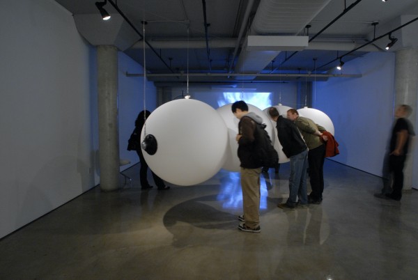 Breathing Under Water engages viewers in a dramatically spatialized experience of embodiment by providing an array of acoustic, tactile and visual stimuli. Large suspended, inflatable forms resonate with low sounds, inviting both touching and listening, while a video projection depicts the floating draperies and repetitive movements of a woman submerged in water.