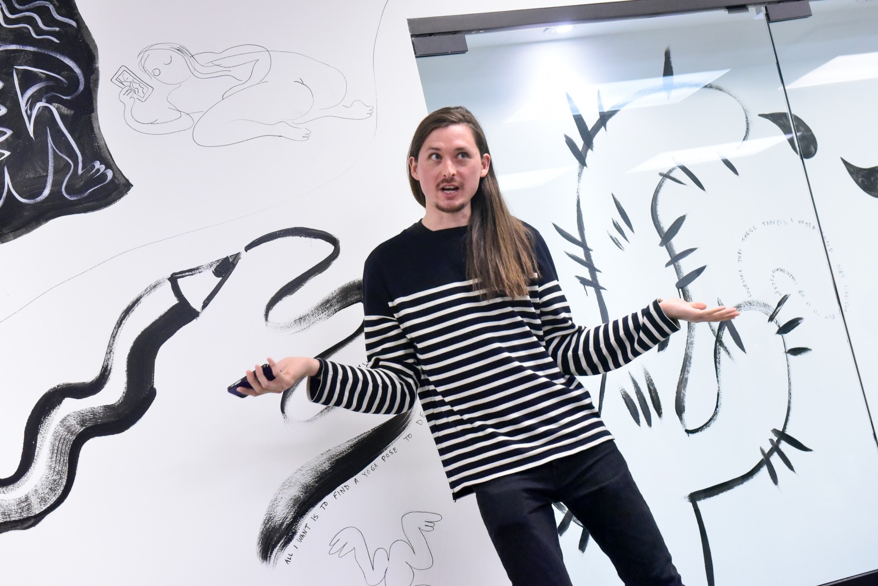 Sequel to Guts is a collage of new and existing writing, reconfigured to create original associations between the fictions and reality of the artist, the audience and the gallery environment. Against the backdrop of a new, site-specific mural, Scott will animate the forms and narratives of the drawing: as the written words are performed over the changing backgrounds, they will create associations with the images encountered along the way.