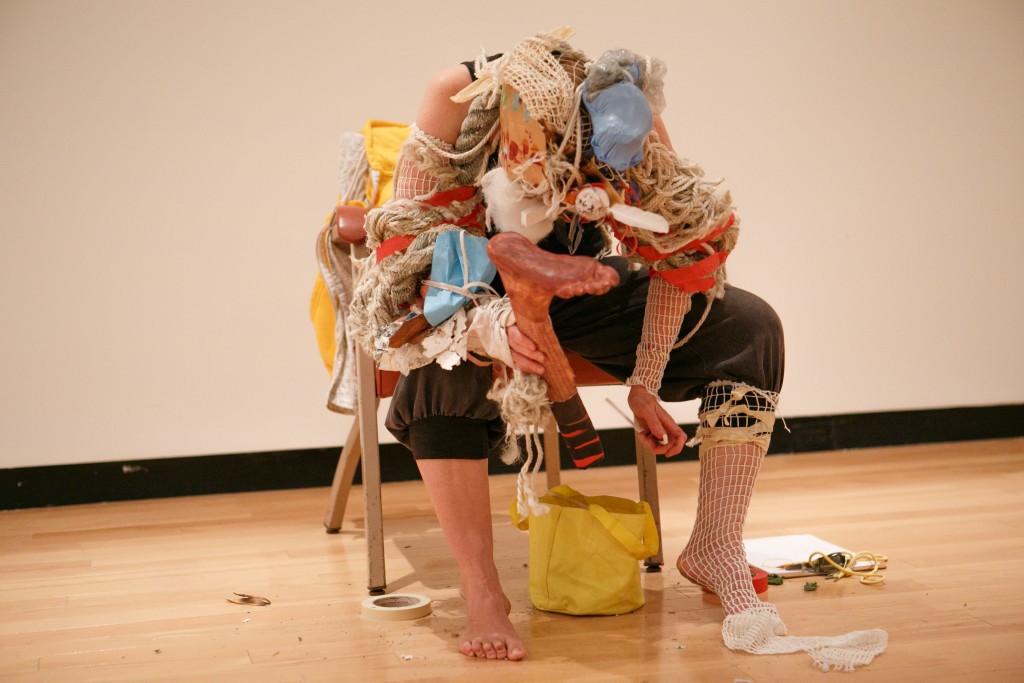 Durational performance by Flesh of the World artist Raphaëlle de Groot features audience participation, a collection of materials, found objects and accessories. Within her engagements with other bodies, de Groot collectively produce signs, marks and accounts through note-taking during a process of undertaking various physical and situational constraints—obstructed vision, restrictive wear, covering up the face.